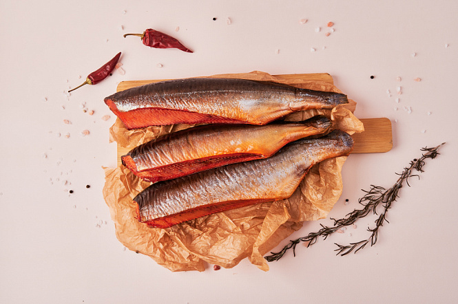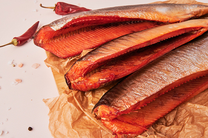 Горбуша горячего копчения (весовая) — ароматная красная рыба с насыщенным вкусом и нежной текстурой. Благодаря традиционному способу горячего копчения горбуша приобретает аппетитный аромат и красивый золотистый оттенок.
