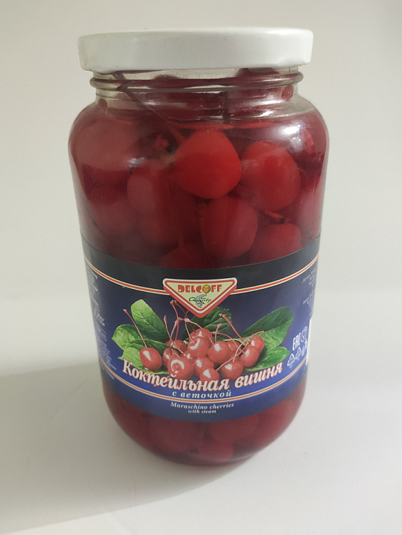 Вишня коктейльная красная с веточкой "Делькофф" (0,680кг/1,085кг/720мл) кор.12шт