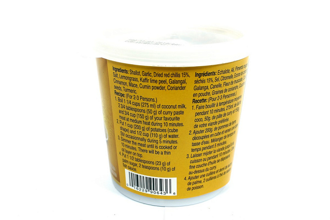 В воке на растительном масле обжариваем желтую пасту карри AROY-D (30 гр), затем в вок добавляем пальмовый сахар (10 гр), куриный бульон (100 мл), кокосовое молоко AROY-D (250 мл), тамаринд AROY-D (20 гр), рыбный соус AROY-D (5 гр ) и сок лимона (15 гр). Довоодим до кипения и варим 5 минут. Затем добавляем ростки бабмука AROY-D (можно заменить на картофель) (20 гр), нежирную рыбу (хек,минтай,треска) (500 гр) добавляем куриный кубик (2 гр) и тушим 10 минут.