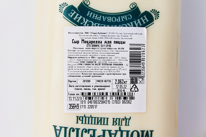 Сыр Моцарелла для Пицца "Николаевская сыроварня" жир.40% вес.